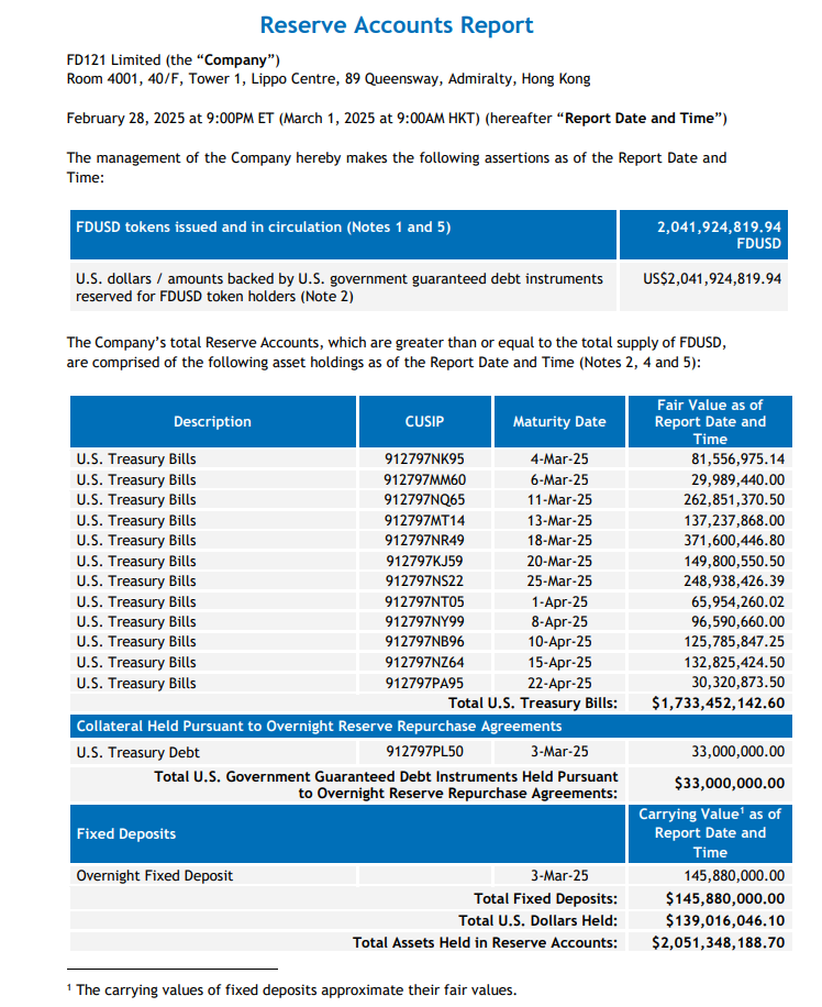 此外, 香港会计师事务所 Moore CPA Limited 提供的证明显示 ,截至 2024 年 11 月,FDT 管理着 TrueUSD 5.01 亿美元的储备。同时 First Digital 发布了 二月储备金报告显示 ,First Digital 储备资产总额为 2,051,348,188.70 美元,FDUSD 发行量为 2,041,924,819.94 枚,储备资产超过 100% 覆盖已发行 FDUSD,符合 1:1 储备要求。