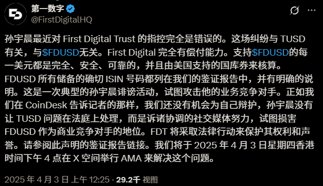 与此同时 First Digital Trust 发推发否认孙宇晨的不实指控,称其试图损害 FDUSD 作为商业竞争对手的地位,并将采取法律行动来保护其权力和声誉。同时将在香港时间 4 月 3 日 16:00 在 X 进行直播 AMA 回应此事。