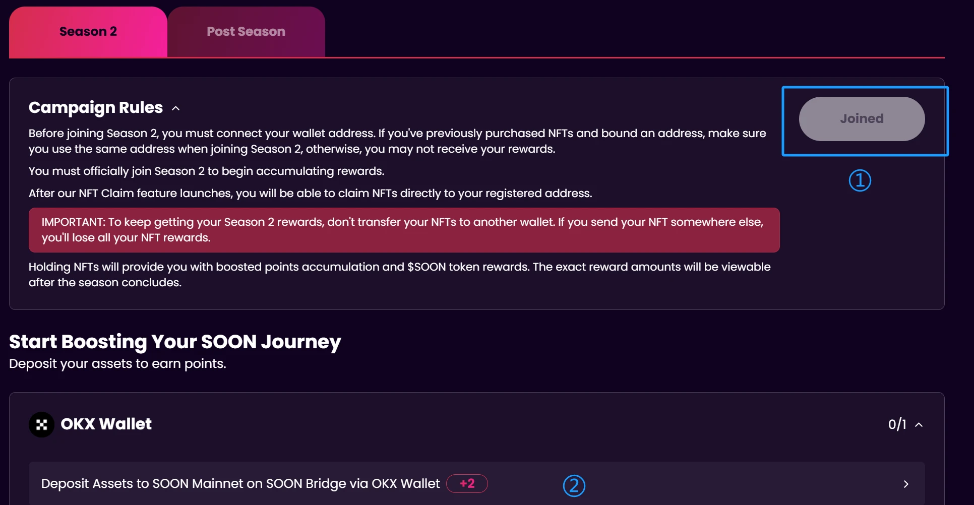 要进行这项任务需要先连接 SOON 钱包,然后“ 加入” BigBang Season 2 活动,在此之前的链上活动是不计算在内的,这一点要特别注意。如果读者朋友在之前就购买 NFT 并绑定过地址,请务必使用同一个地址。