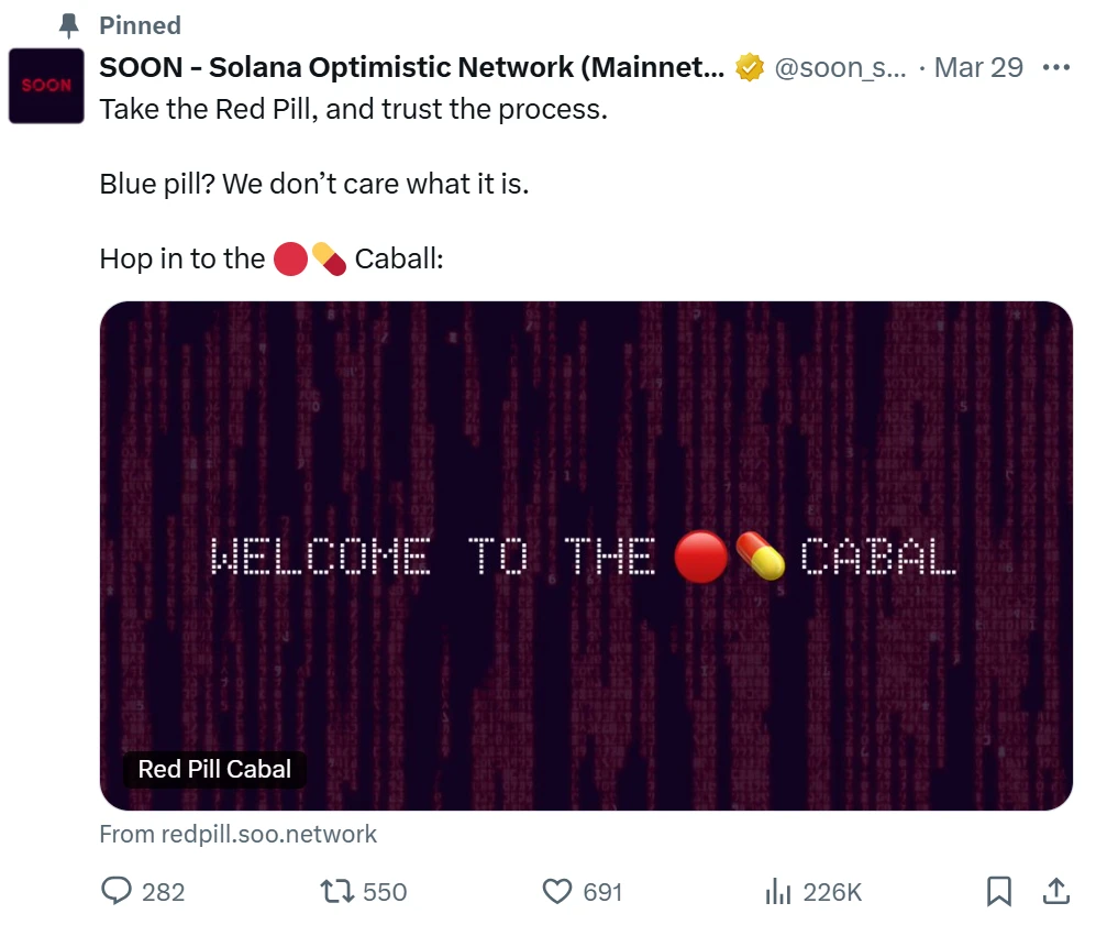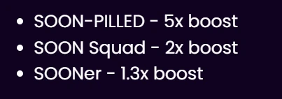 社交媒体互动 : 通过发布推文并使用#SOONISTHEREDPILL 标签,参与者可赚取积分。近期 CZ 转发 SOON 推文后,这一环节的参与度大幅提升。