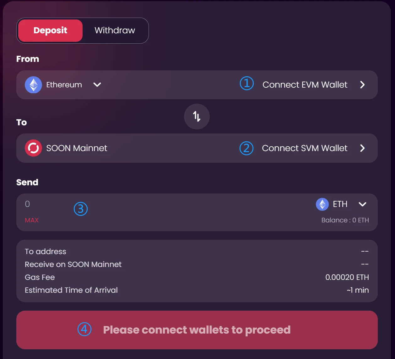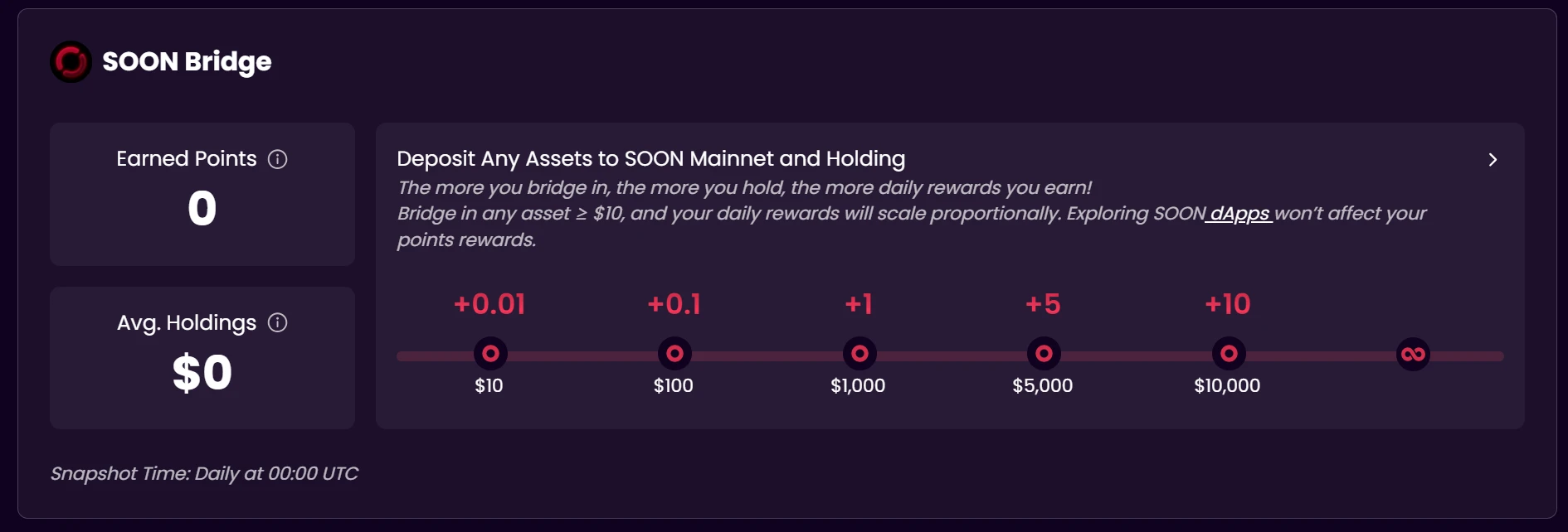 存款 :通过 官方提供的网址 进行桥接存款,这是获得空投的主要方式之一。 部分高价值任务要求用户在 SOON 主网上存入一定资产(如至少价值 $ 1000 的 ETH 或稳定币),以确保生态的长期活跃度和资金流动性。