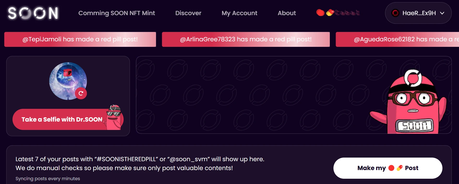 链接 X 账号,关注 SOON 官方账号( @soon_svm )发送推文并带#SOONISTHEREDPILL 标签或者@soon_svm,增加社区曝光,该推文会经由人工审核才能获得积分。