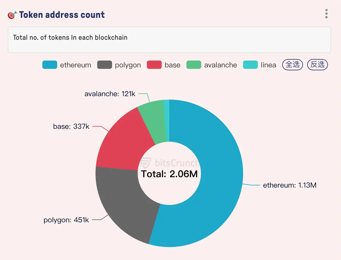 从整体数据来看,大部分代币依旧发布在以太坊上。根据bitsCrunch数据,在以太坊上发行的代币地址数量占所统计总量的54.56%,远超Polygon(451,349个,占比21.88%)和第三名Base(336,616个,占比16.32%)。Avalanche(120,587个,5.85%)与Linea(28,264个,1.37%)则相对较后。
