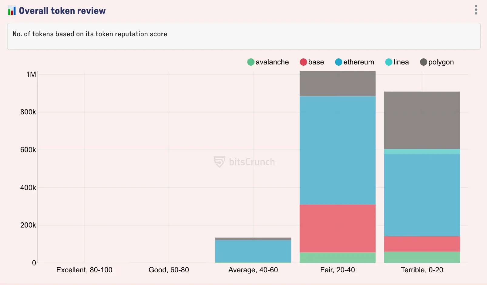 Polygon和Base的代币总量分别位居第二和第三。以Polygon为例,其45万代币中有5个被评为“Excellent”,而“Fair”和“Terrible”区间代币占比高达96.7%。在Base链的33.6万代币中,“Fair”区间占比75.6%(254,482个),“Average”区间有67个代币。