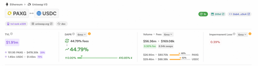 在 PAXG/USDC 池中,一边是锚定黄金价格的稳定币 PAX Gold(PAXG),另一边是锚定美元的稳定币 USDC。由于黄金价格波动性远低于加密资产,USDC 又始终维持在 $1,因此这对资产之间的价格比值相对稳定,从而显著降低了无常损失的风险。