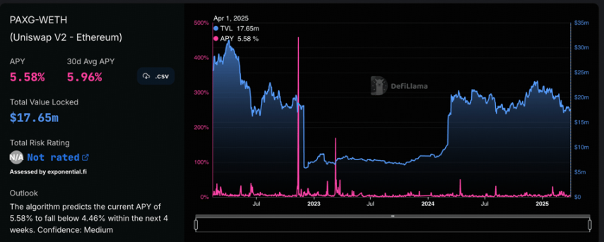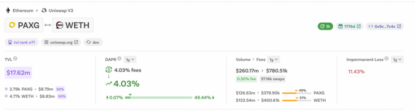 另一种选择是 PAXG/WETH 流动性池,该池支持黄金与以太坊之间的兑换。这个池子通常流动性更高,但也更容易出现「无常损失」(Impermanent Loss),因为 PAXG(跟踪金价)较为稳定,而 WETH(跟踪 ETH)波动性极高。当 ETH 价格剧烈波动时,两种资产的相对价值会迅速背离,从而引发较大的无常损失风险。