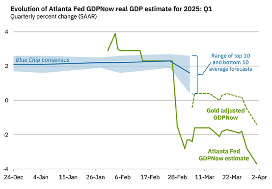 但值得注意的是,美国经济切实出于增长放缓中,根据GDPNow的模型,美国2025年第一季度的GDP增长预期已来到-3.7%,可看出市场对美国衰退的预期正在逐步形成共识。实际上,美联储已然因当前特朗普的政策主张陷入两难境地,若出现衰退迹象则必然需降低利率,但通胀率的随之上涨又阻碍其降息,在此背景下,滞涨也不乏可能性。而出于对滞涨的考虑,美联储库格勒此前也表示,美国并非处于滞胀环境,但美联储正密切关注经济放缓和物价。