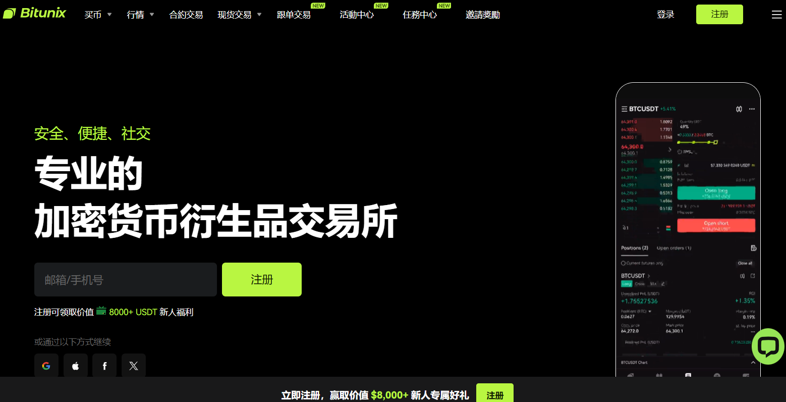Bitunix是主打匿名交易与极简体验的期货交易平台,支援500多个交易对,包括BTC、ETH、APE、UNI等。用户无须KYC即可注册并启用交易,最高杠杆达100倍,并支援反向与永续合约,适合策略型及高频交易者。