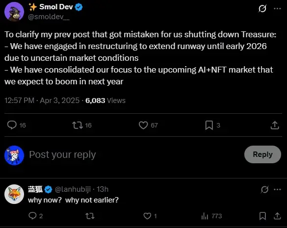 中文圈 KOL 蓝狐曾经是 TreasureDAO 的支持者,他在 John Patten 的推文下评论道,「为什么是现在?为什么不是更早?」