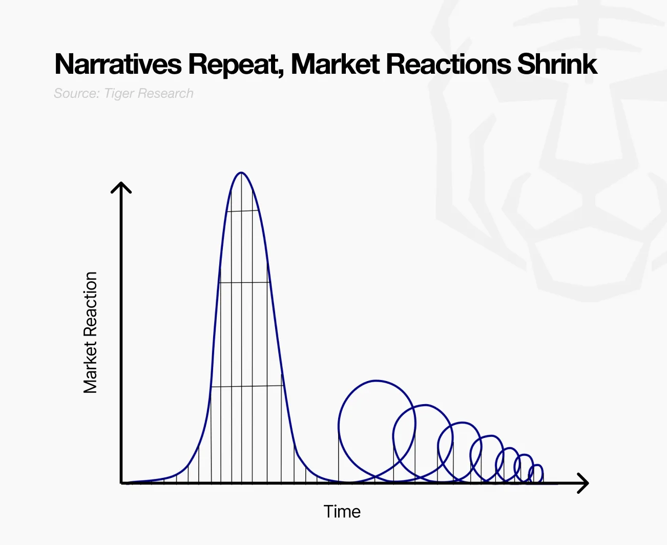 但市场参与者对此模式已高度熟悉,削弱了叙事响应效能。单纯预期驱动的价格上涨难以持续,涨幅较前周期显著收窄,凸显叙事驱动模式的局限性。