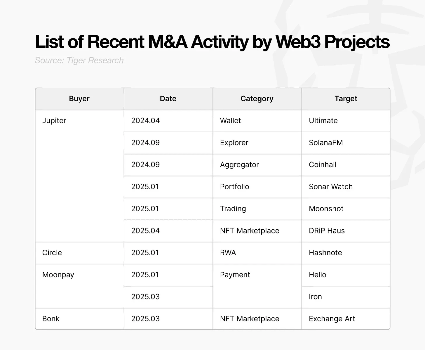 激进并购实现垂直整合,本质是行业成熟与竞争激化下的必然选择。企业需要统一用户体验,创造服务协同效应以抢占市场份额。Jupiter 通过收购 Meme 币交易应用 Moonshot、NFT 市场 DRiP Haus、加密投资组合服务 SonarWatch 等案例,整合 Solana 生态交易功能;加密支付公司 Moonpay 收购 Solana 支付应用 Helio;稳定币发行商 Circle 收购 Hashnote。这些垂直整合标志着Web3行业的重要范式转变。