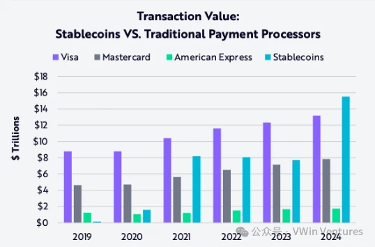 2024 年全球稳定币交易额已达到 15.6 万亿美元,超越传统支付巨头 Visa 和万事达卡同期规模,成为全球最重要的价值传输网络之一,其中保守估计一半以上体量来自于跨境支付场景。