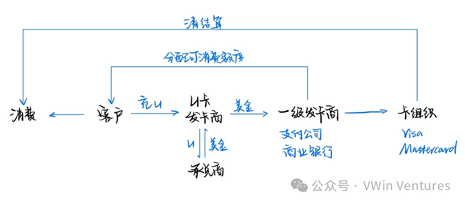 C 端客户 – 二级发卡商【接第三方承兑】 – 一级发卡商(如商业银行、支付公司等) – 卡组织(Visa、Mastercard)