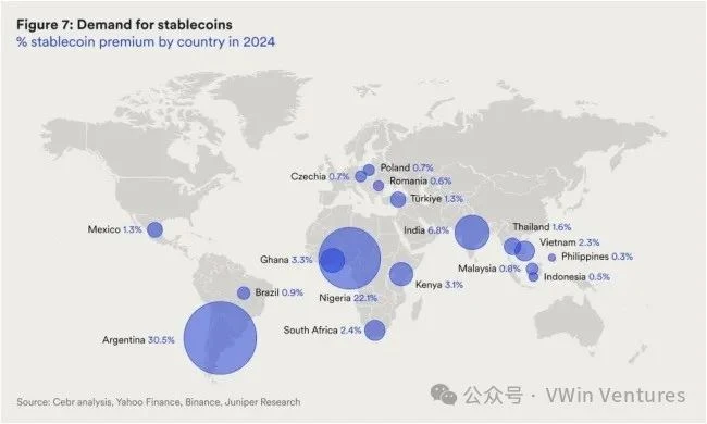 灰色扩张: 以 USDT 为典型代表,背靠监管套利需求,大量用于投机、菠菜下注、规避金融监管等灰色场景,广泛应用于东南亚、拉美、非洲等外汇管制地区,迅速扩张用户基数和市场渗透率。