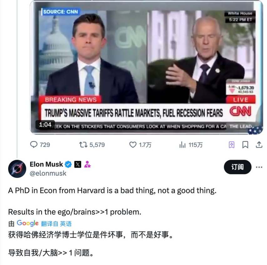 就连与特朗普总统相交甚好的马斯克,前几天也在社交媒体上公开表达了对这位总统顾问的批评和暗讽,直言「获得哈佛经济学博士学位不是件好事,可能因过度自负而导致决策失误」;并质疑纳瓦罗从未亲手创造过任何实质性成果。