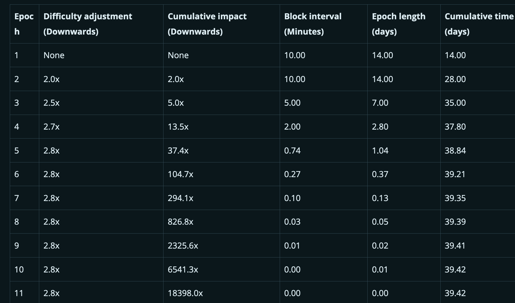 每个周期的难度向下调整渐近到略高于2.8倍。这是因为随着每个周期在时间上变短,难度调整减速的速率降低。