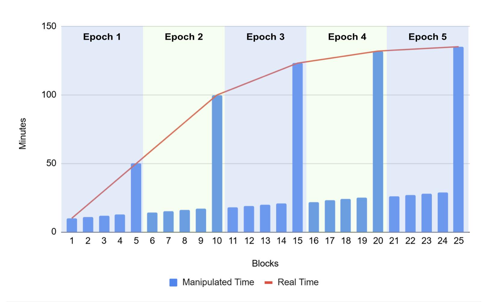 比特币的时间扭曲攻击约在2011年首次被发现,利用了中本聪在难度计算中犯的错误。要进行攻击,假设挖矿是100%中心化的,矿工可以设置协议允许的任何时间戳。在攻击中,对于几乎所有区块,矿工将时间戳设置为比前一个区块前进一秒,因此区块链在时间上向前移动,并遵守MTP规则。为了尽可能慢地向前移动时间,矿工可以连续六个区块保持相同的时间戳,然后在下一个区块中将时间增加一秒,以此类推。这意味着区块时间戳每六个区块向前移动一秒。