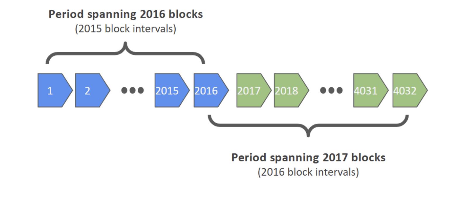 在比特币中,一个难度调整周期包含2016个区块,以10分钟区块目标计算,这大约是两周的时间。为了计算 挖矿难度调整 ,协议计算相关2016区块窗口中第一个和最后一个区块之间的时间戳差。这个2016区块的窗口包含2015个区块之间的间隔(即2016减一)。因此,使用的相关目标时间应该是60秒 * 10分钟 * 2015个间隔,等于1,209,000秒。然而,比特币协议使用数字2016来计算目标。60秒 * 10分钟 * 2016 = 1,209,600秒。这是一个差一错误。这是一个容易犯的错误,中本聪似乎混淆了区块与区块之间的间隔。