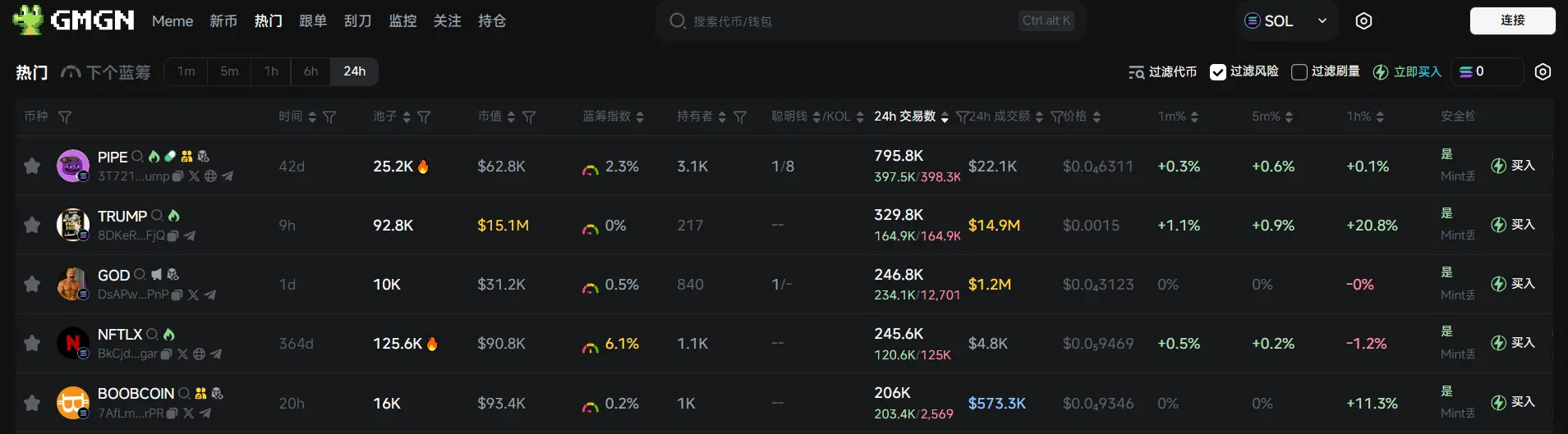过去 24h Solana 热门代币前五依次为:PIPE、 TRUMP、GOD、NFTLX、BOOBCOIN