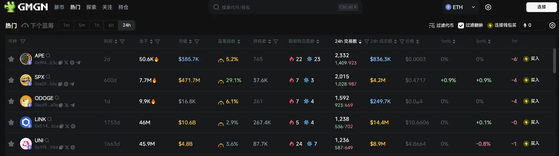 过去 24h 以太坊热门代币前五依次为:APE、SPX、ODOGE、LINK、 UNI