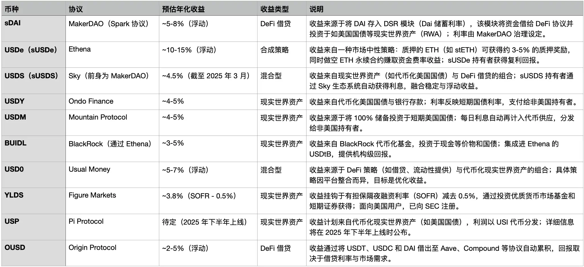 什么是生息型稳定币?它是一种保持锚定在 1 美元的稳定币,同时还能带来被动收益。怎么实现的?通过借贷、质押,或投资于像美国国债这样的现实世界资产。可以把它想象成链上的货币市场基金,但它是可编程的、无国界的。