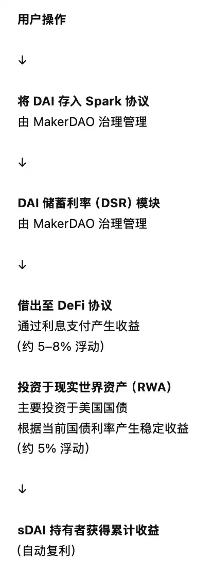 你会收到 sDAI,这是一种基于 ERC-4626 标准的代币,价值会自动增长(不会重定基),收益率由治理机制根据市场情况进行调整。