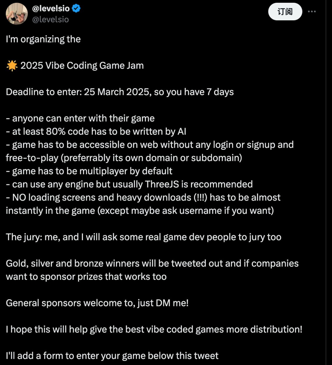 目前,Memeapp 更多以可交互网站和小游戏的形态出现。这已经激发了人们的创造力。知名独立开发者 @levelsio 在推特上举办了 Vibe coding 大赛。Solana 同样也推出了类似的名为 Vibe Jam 的比赛。