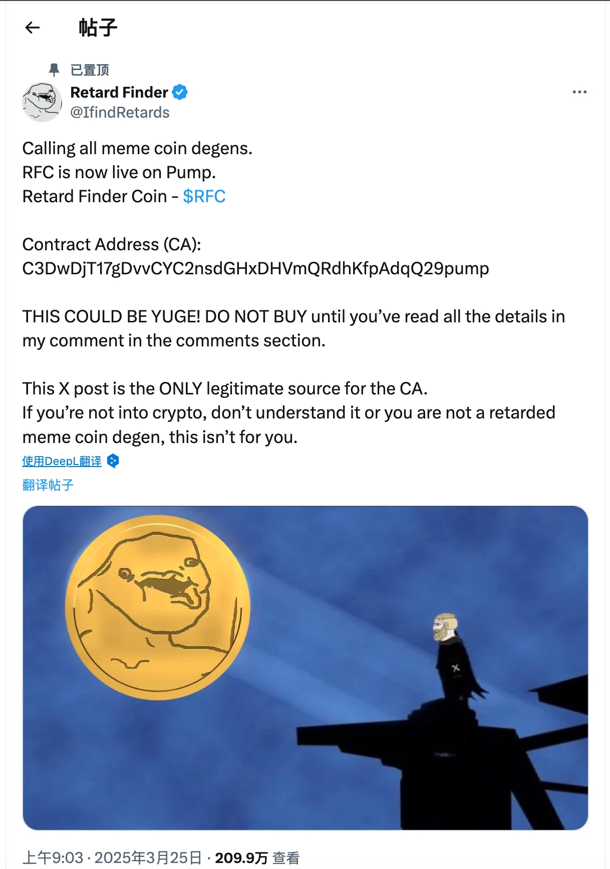 3 月 7 日,当整个加密市场沉浸在暴跌的悲伤行情时,一个名为「RFC」(Retard Finder Coin)的马斯克概念 Meme 项目逆势拉盘。根据 GMGN 数据,RFG 在过去 48 小时内价格飙升超过 200%,市值最高逼近 3000 万美元。