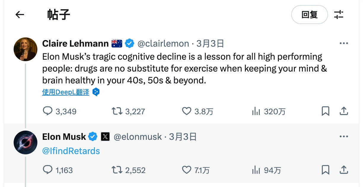 2025年3月,马斯克曾在X上回复一则批评他「认知能力下降」的帖子时,直接@了该账号。此前,Quillette创始人 Claire Lehmann曾发帖称马斯克依赖药物而非锻炼来保持头脑清醒,马斯克则以轻描淡写的方式 @IfindRetards,仿佛在暗示「我找到了一个蠢货」。这一互动不仅让该账号曝光量激增,也被视为马斯克对其「 troll文化」的默许和认可。