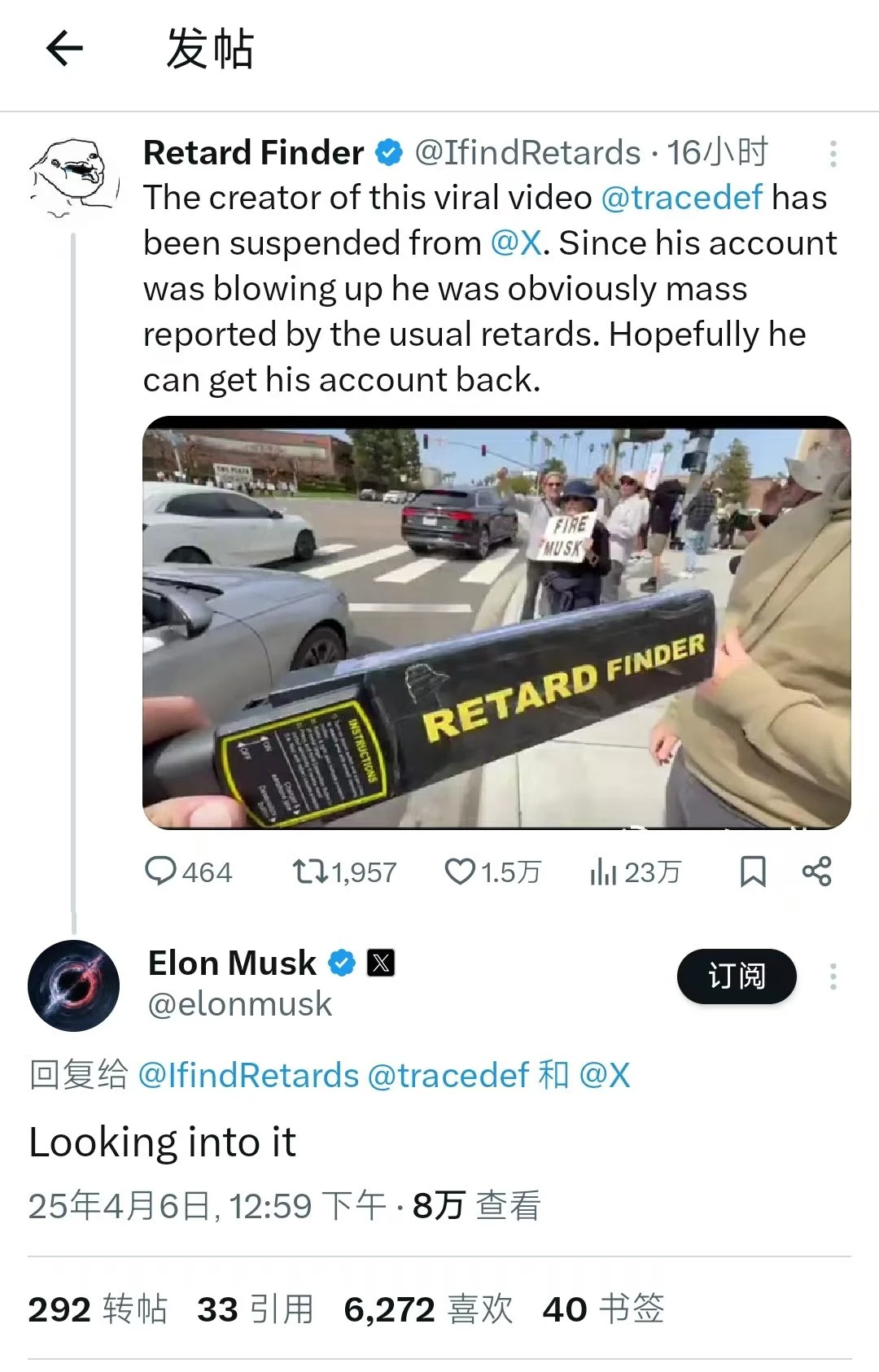 Retard Finder最初是凭借一则简单而富有讽刺意味的帖子迅速走红:当有人在特斯拉Cybertruck上涂鸦纳粹标志时,其仅以一句「Found one」并配上事件截图回应,简练的幽默风格立刻引发广泛传播,也奠定了其「用最少文字揭露荒谬」的风格基调。此后,许多用户自发开始在 X 平台上与Retard Finder互动,每当他们发现自己认为的「智障言论」时,都会@该账号;Retard Finder 也会选择性转发这些账号推文,娱乐大众。