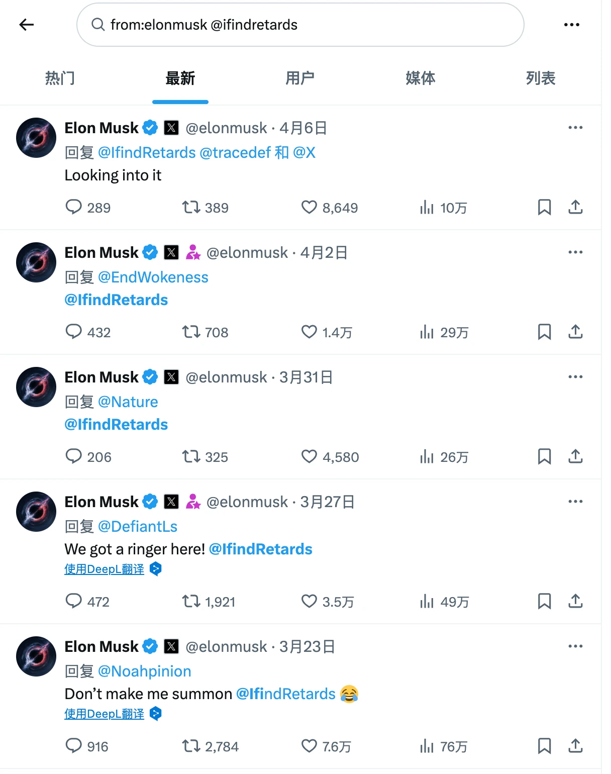 通过在马斯克主页搜索「from:elonmusk @ifindretards 」 ,不难发现这两个账号之间的互动异常频繁。在过去35天内,双方共进行了22次互动,其中11次为马斯克主动@对方,远超其与特斯拉官方账号(@Tesla) 3-5次的月均互动频率。
