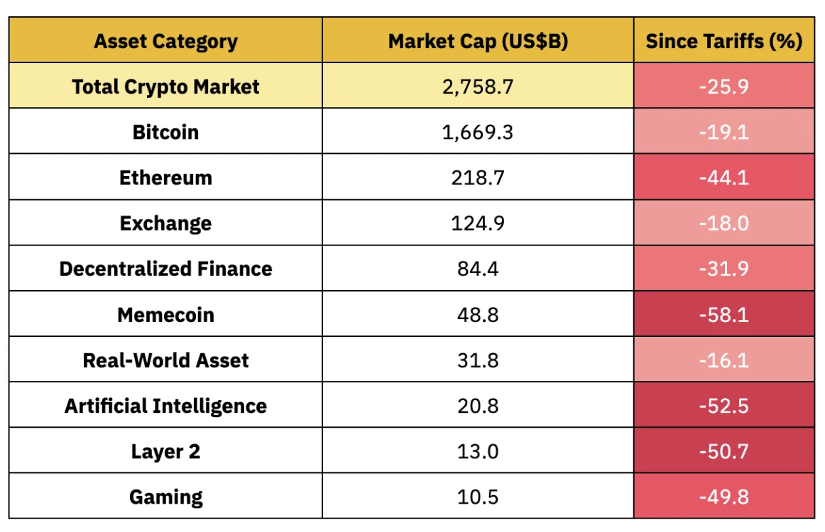 市场情绪明显转向谨慎,投资者对关税公告做出典型的“风险规避”行为。加密市场总市值自 1 月高点下跌了约 25.9% ,市值蒸发近 1 万亿美元,凸显了其对宏观经济不稳定因素的高度敏感性。