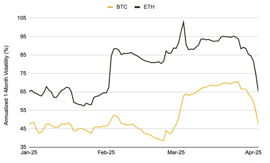 图表 6 :在此阶段,BTC 的一月实际波动率上升至 70% 以上,ETH 超过 100% ,反映出关税公布后的市场剧烈波动