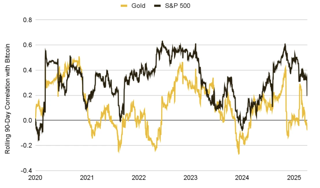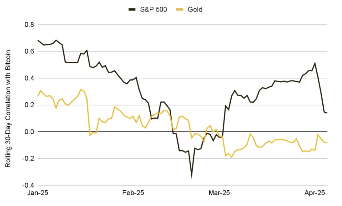 相比之下,比特币与传统避险资产如黄金的相关性则明显削弱——原本中性至正向的关系在 4 月初变为– 0.22 的负相关。