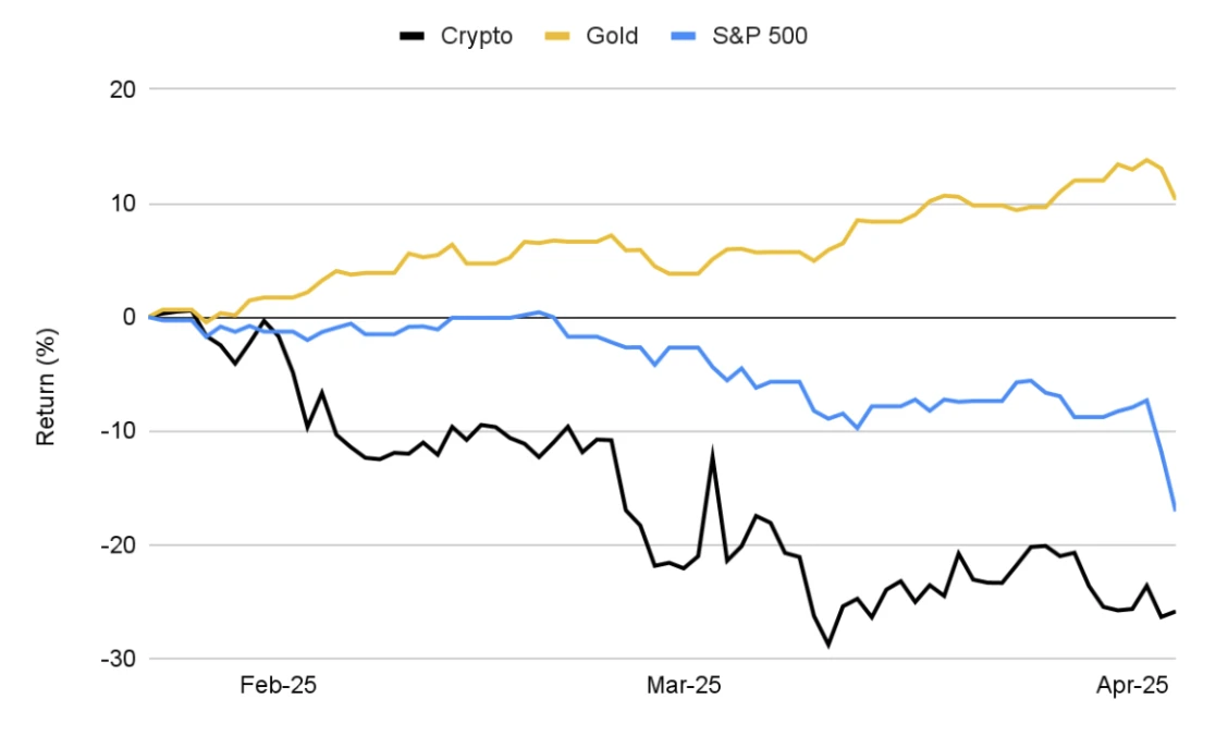 图表 3 :自初始关税公告以来,加密市场下跌 25.9% ,标普 500 指数下跌 17.1% ,而黄金上涨 10.3% ,并连续创下历史新高