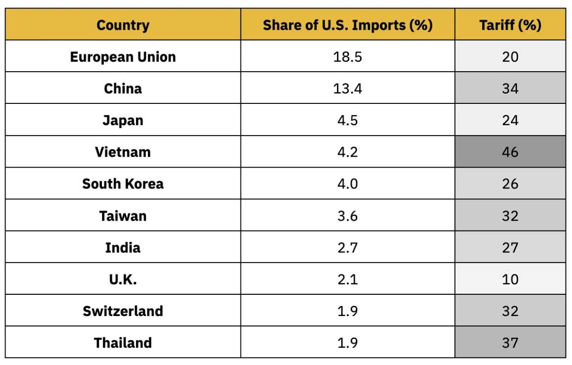 基础关税: 美国宣布对所有进口商品征收新的 10% 统一关税,逆转了几十年来的贸易自由化进程。该基础税率已于 4 月 5 日生效。