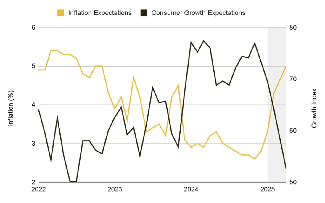新关税相当于对进口商品征收了大量额外税费,正值美联储试图压制物价增长之际,为通胀压力火上浇油。市场上已显现出对这些措施可能破坏通胀回落进程的担忧。市场化指标如一年期通胀掉期已飙升至 3% 以上,而消费者调查中的预期也升至 5% 附近,均显示人们普遍预期未来 12 个月内物价将持续上行。