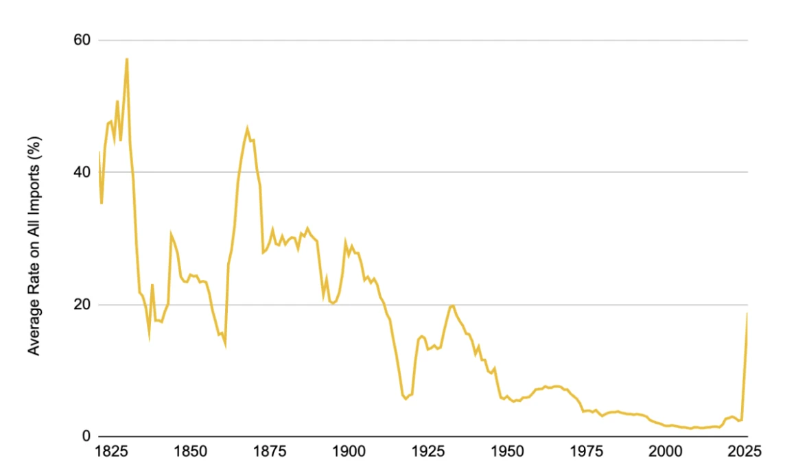 这些政策使美国的进口税率飙升至自 1930 年《斯穆特-霍利关税法》实施以来的最高水平,该法案曾在大萧条时期对数千种商品征收全面性关税。根据现有数据,美国的平均关税率已升至约 18.8% ,部分估算甚至高达 22% ——相比 2024 年的 2.5% ,这是一次极为剧烈的跃升。