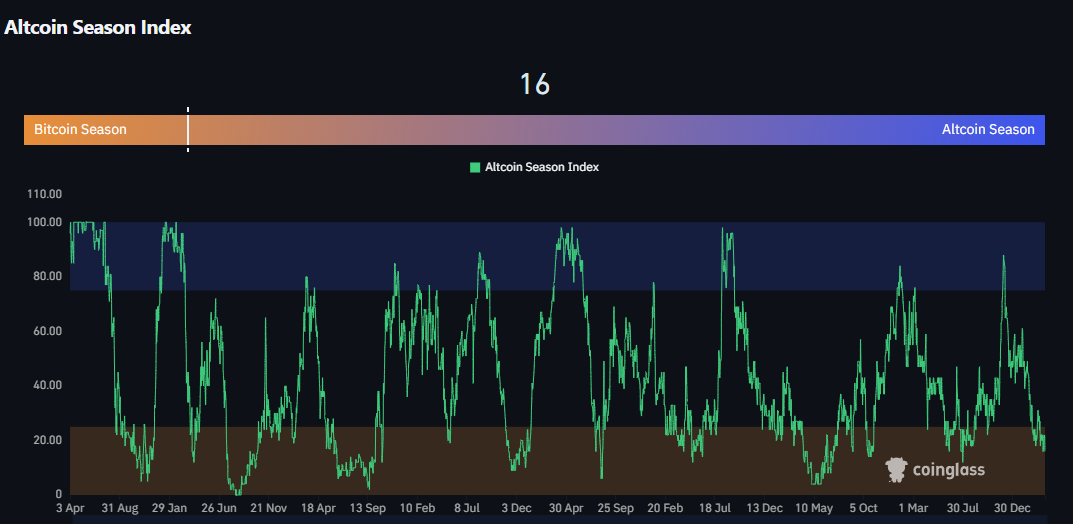 然而,2025年的山寨币市场已是一片冷清。山寨季指数(Altcoin Season Index)跌至新低16,显示山寨币的整体表现已跌至谷底。市场分析师指出,按照末端加速的逻辑,未来一个季度可能是山寨币寻找底部的关键时段。曾经的狂热已化为泡影,投资者对山寨币的信心几乎崩塌,甚至连以太坊这样的龙头山寨币也未能幸免。山寨季的幻梦,正在冰冷的现实中碎裂。