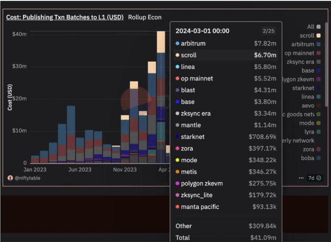 2024年3月,Arbitrum为以太坊Blobspace支付了782万美元。