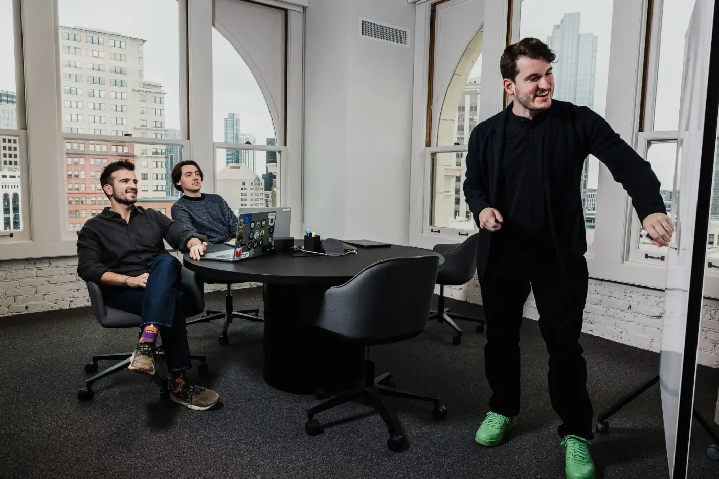 在一个寒冷的早晨,我参观了Paradigm 位于旧金山的公司,Huang的两个团队成员正在研究一种机制,这种机制可以重塑数千亿美元数字资金在金融系统中的流动方式。在一间顶层会议室里,会议室的弧形就像大教堂的回音廊,合伙人Dan Robinson一边用 “Paradigm 绿”的耐克 Air Force 1 鞋敲着地板,一边以高频交易的速度解释他们的最新突破。研究合伙人Dave White戴着六边形眼镜,留着凌乱的胡子,俯身在他的笔记本电脑前,不时停下来讨论他所发明理念背后的方程式。Huang认真地听着,他那运动员般的身躯裹着一件朴素的黑色日本毛衣,举手投足间带着一种始终领先于人的安静权威。