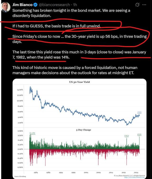 根据著名研究机构Bianco Research的创始人吉姆·比安科(Jim Bianco)的统计,自上周五到现在,30年期美债收益率在短短不到三个交易日的时间内上涨了56个基点。上一次收益率在3天内上涨这么多是在1982年1月7日。但要知道,当时美债收益率可是要高达14%(56个基点在当时还不算什么)。比安科表示,这种历史性的行情显然是由强制清算引起的。
