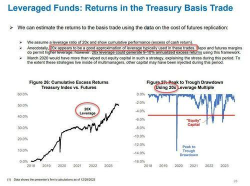 目前,虽然规模高达万亿美元,但美债基差交易的主要头寸其实集中在不到10家对冲基金手中,以千禧年(Millennium)、城堡(Citadel)、Balyasny、Poin72、ExodusPoint和Lighthouse为代表。业内预计它们的平均杠杆倍数为20倍。这也意味着只要相关基差交易损失达到5%,它们就可能将全军覆没,不得不追加保证金。