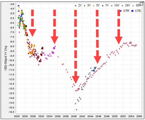 资产互换利差的单日波动堪称惊人(请注意这是24小时内的变动),这至少是我职业生涯中见证过最剧烈的波动之一。当前市场已完全陷入流动性真空: