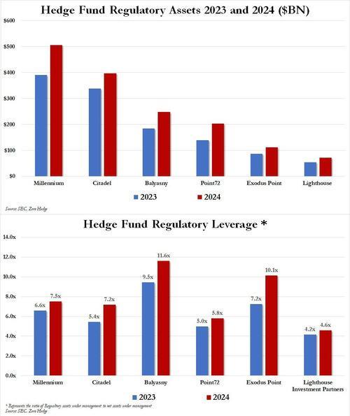注:上图是六大对冲基金前年和去年的资产规模对比,下图为杠杆倍数对比