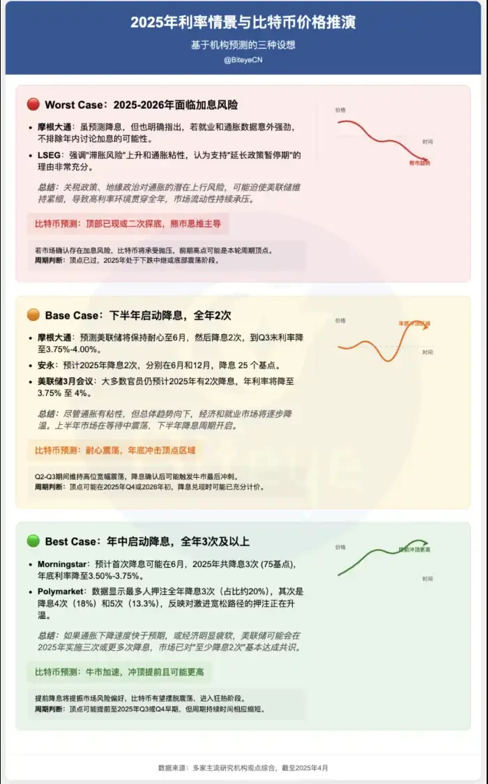 当前(2025 年 4 月),对于美联储的下一步动作,市场分歧明显。我们综合近期多家主流研究机构观点,总结出三种可能情景: