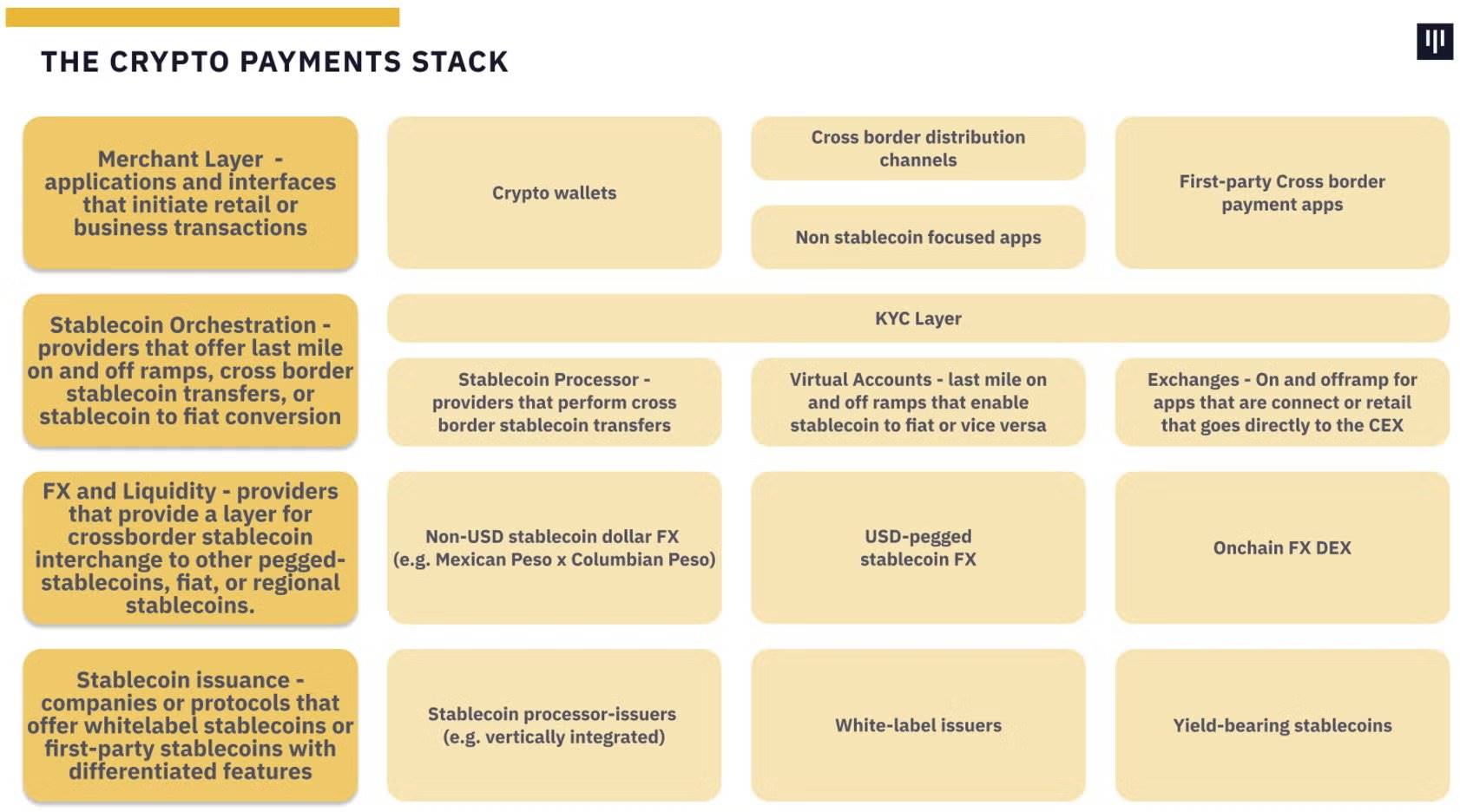 Dmitriy 提供了一个深入且技术性强的视角,而其他机构,比如 Pantera 在其报告 “ The Trillion Dollar Opportunity ”,则从更高层次将支付体系分为四个层级。