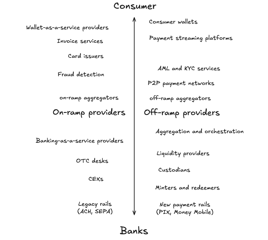 在这一层之下,是帮助稳定币和法币尽可能无缝流动的公司和服务。以下是三个关键层,通常会被聚合和协调: