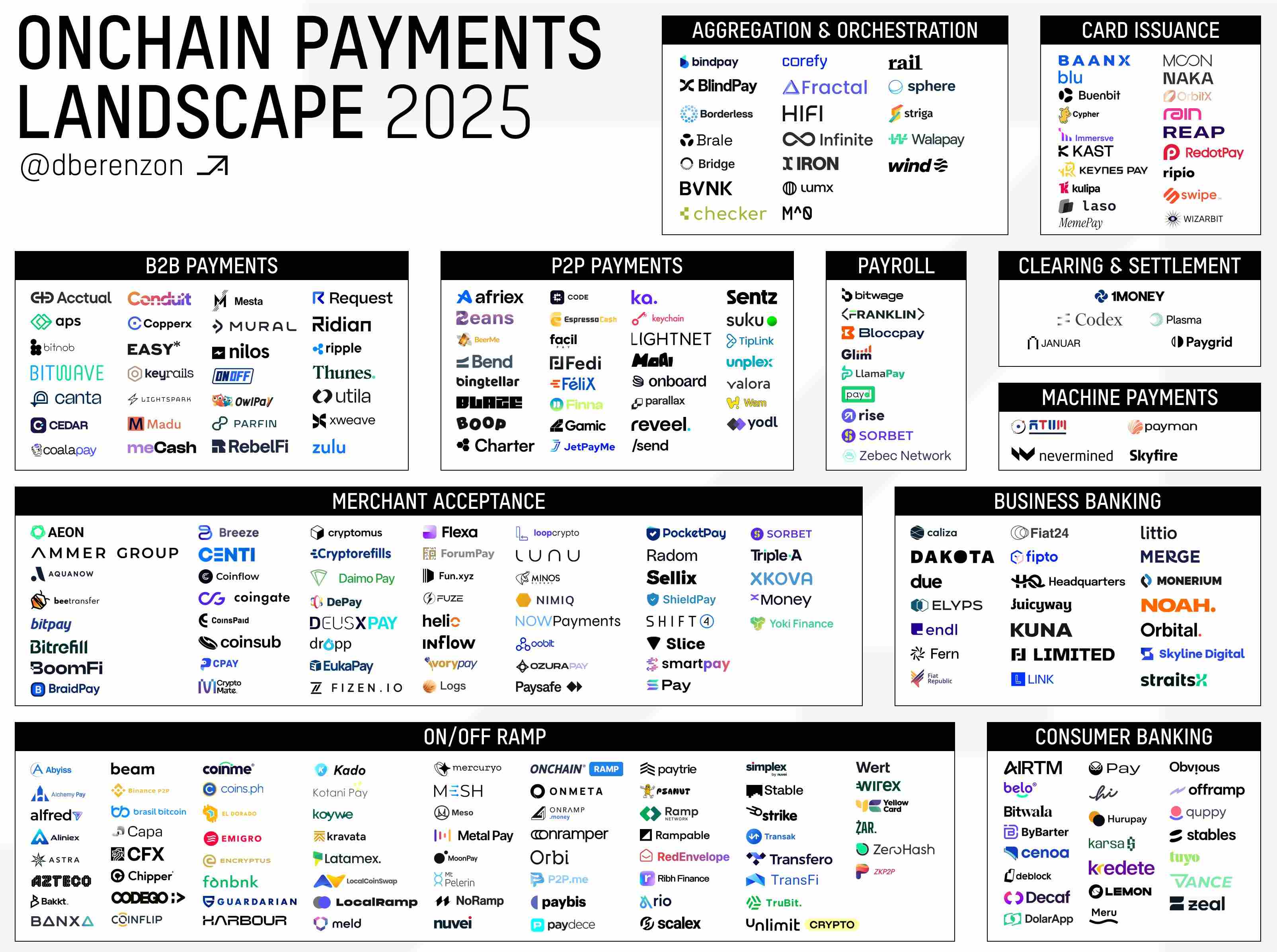 @Dberenzon 整理了一个很棒的页面,将链上支付生态系统细分为九个不同的领域,你可以在下方找到相关内容。