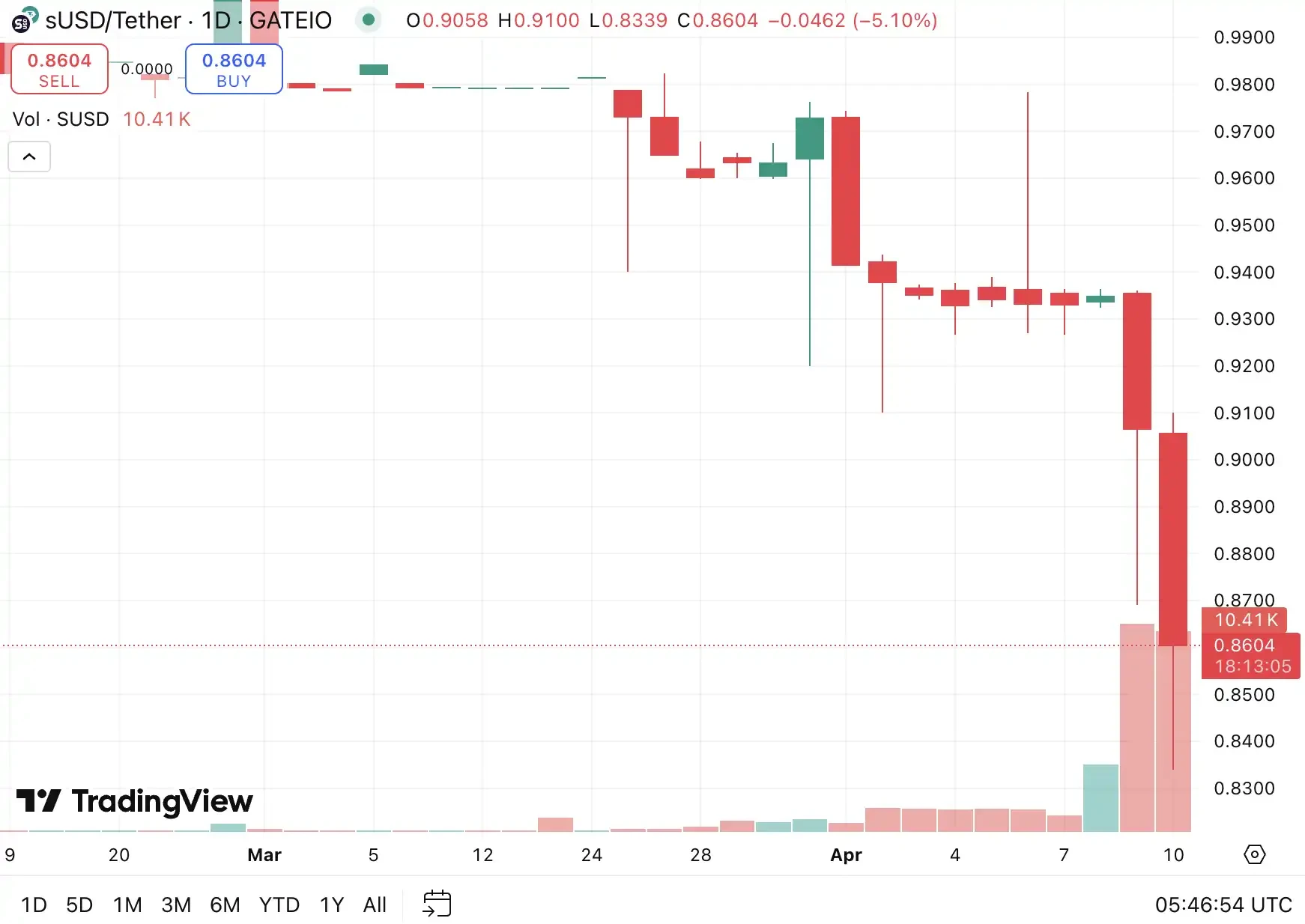 加密世界瞬息万变,稳定币的「稳定」二字也往往面临诸多考验。 4 月 10 日 ,Synthetix 生态中的稳定币 sUSD 出现显著脱锚,最低价格跌至 0.834 美元,现报 0.860 美元,较 1 美元锚定值偏离约 14% 。这一波动迅速引发社区热议,不少人担忧这是新一轮稳定币危机的信号。